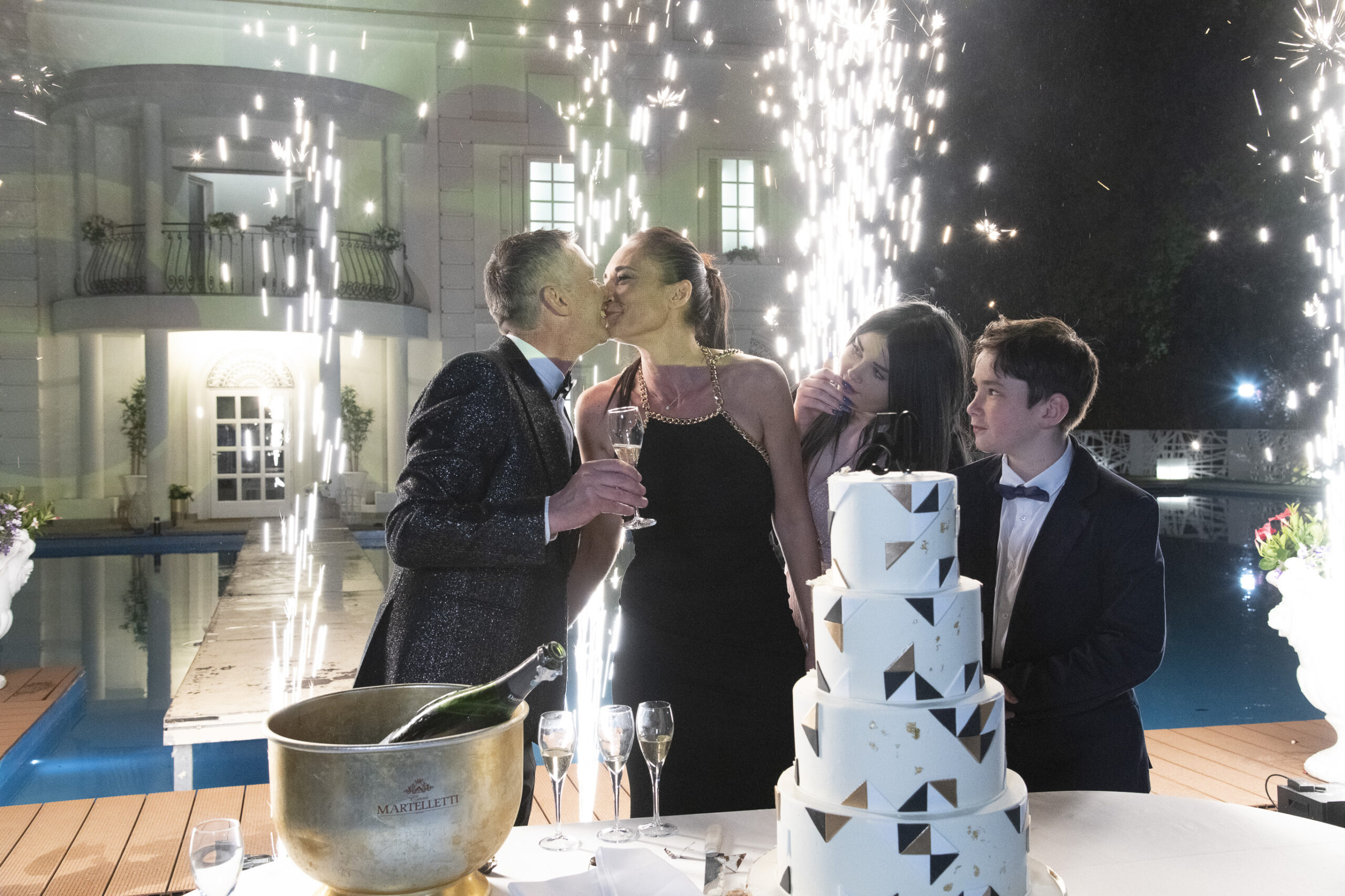 Infine il Taglio della torta con l’immancabile spettacolo pirotecnico della Pluripremiata Pirotecnica 5 stelle accompagnato dai bagliori di infinite fontane luminose, che hanno acceso i 550 metri d’acqua, che incorniciano Villa ReNoir.