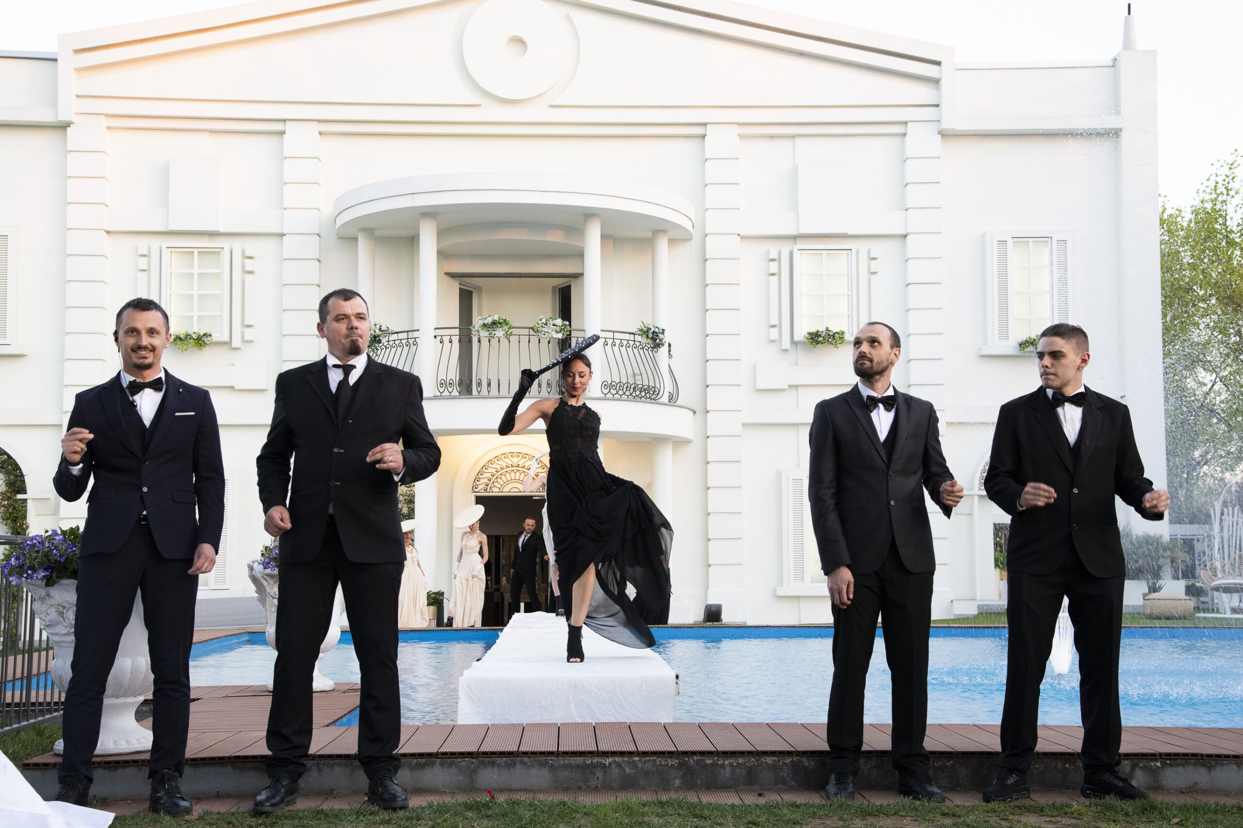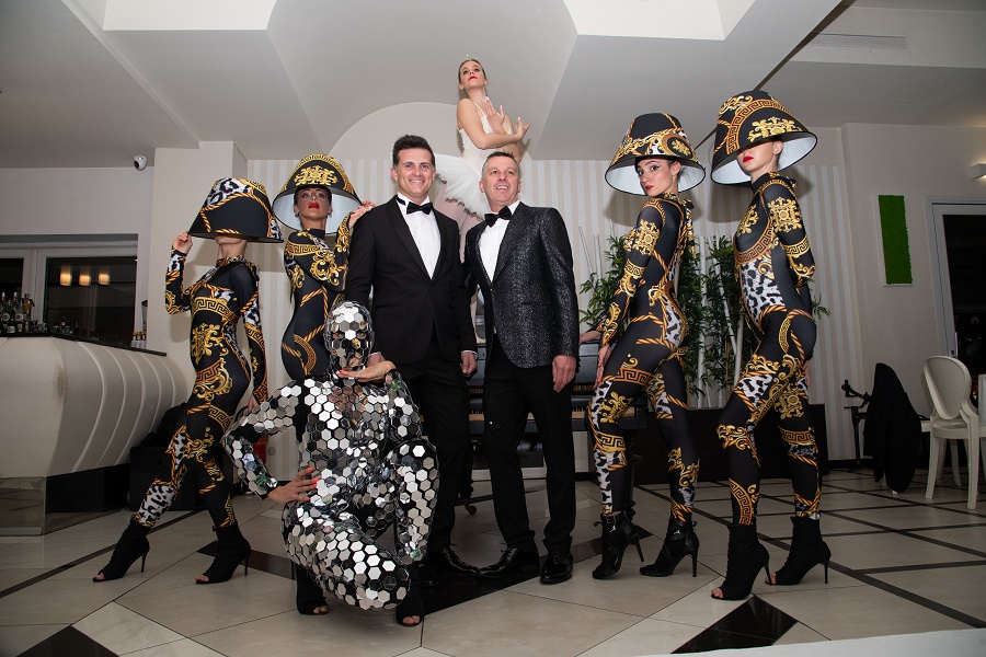 Varcando la soglia d’ingresso gli ospiti si sono ritrovati immersi e avvolti in un’atmosfera unica, sono stati accolti all’ingresso dell’esclusiva Location, dal personale abbigliato con costumi a tema. A ciascuno è stata data una busta con un messaggio personale, ed una banconota raffigurante il festeggiato con la quale si poteva giocare al casinò itinerante allestito per l’occasione. Al cospetto dell’immensa piscina un grande red carpet personalizzato, un Gran buffet per l’aperitivo assortito di varie sfiziosità gastronomiche e cocktail molecolari. L’entrata del festeggiato è stata preceduta da un corpo di Ballo spettacolare con abiti davvero unici ed eleganti.